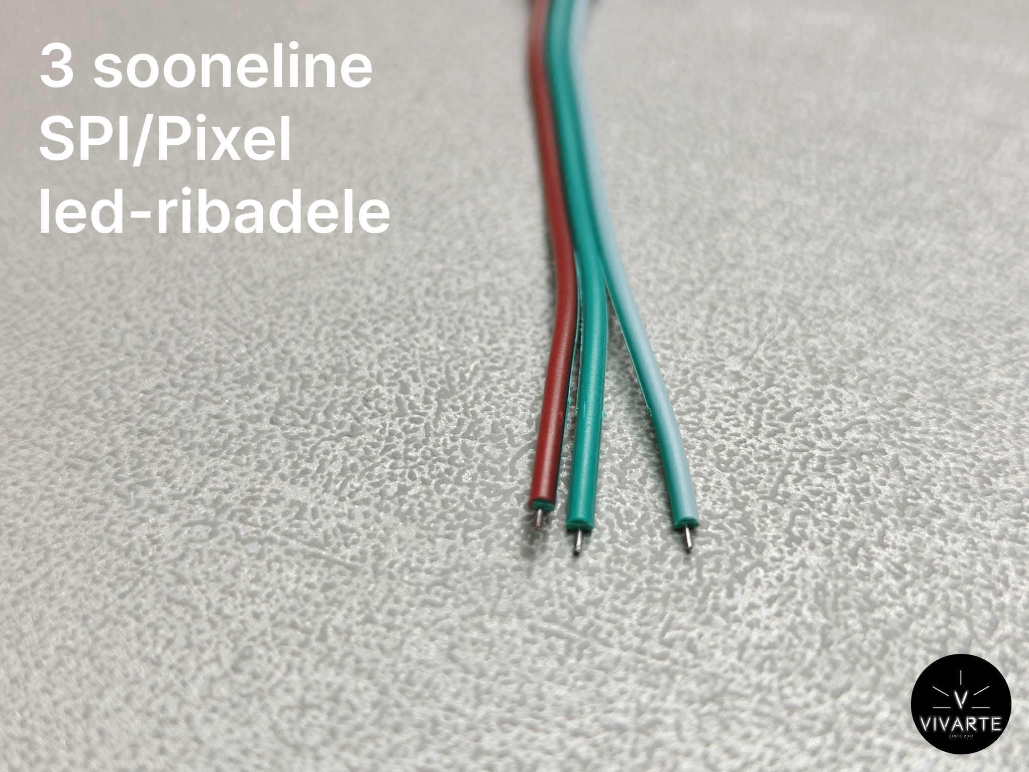 - 3-sooneline SPI/pixel – digiribad; tüüpiliselt V+, DAT, GND (lähtu kontrolleri skeemist).
